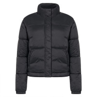 Укороченная куртка-пуховик матово-чёрного цвета, свободного кроя, с карманами на молнии и высоким воротником. Теплая и минималистичная модель для холодной погоды.