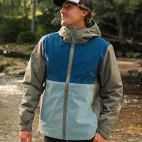 Мужская водонепроницаемая куртка с герметичными швами, цветными блоками, капюшоном и молнией спереди. Создана для активного отдыха и дождливой погоды.