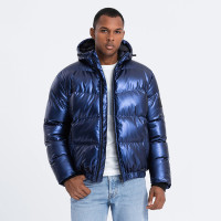 Мужская блестящая темно-синяя стеганая куртка с широкими манжетами, регулируемым капюшоном и застежкой-молнией по всей длине. Отличное решение для уличной моды в холодную погоду.